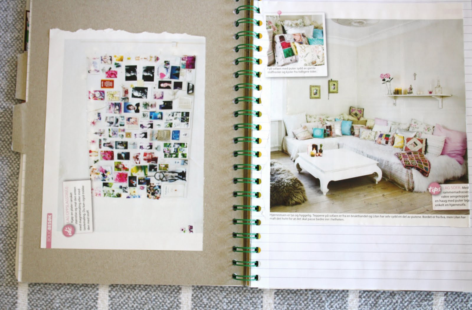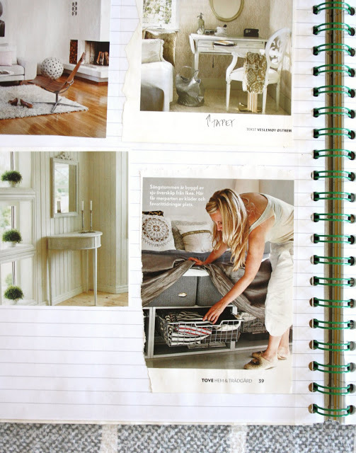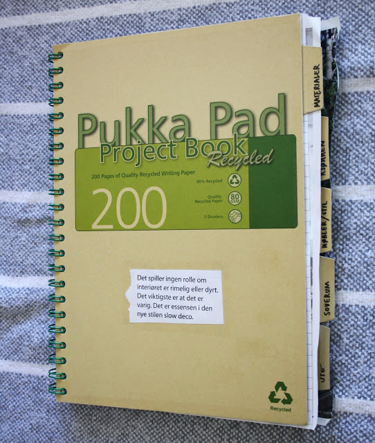 Leikekirjan kanteen olen liimannut jostain sisustuslehdestä leikkaamani tekstin, joka on uuden talon sisustuksen punainen lanka ja muutenkin ajatus, jota kaikissa valinnoissani yritän seurata: