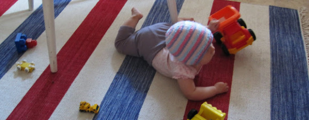 Norjan värit jatkuivat mökin matossa. Aino on oppinut ryömimään.