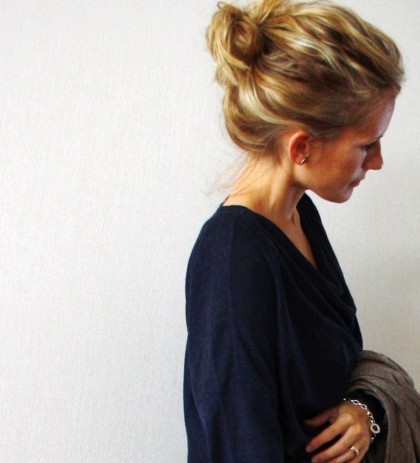 Jumppapäivinä sotkunuttura on arvossa arvaamattomassa. Tänään mulla on pohjalla yön yli nukutut kiharat. Jumppasin aamutunnin kahdella raskalaisella letillä, kävin suihkussa kastelematta tukkaa, avasin letit ja vetäsin sotkunutturalle -koska en jaksanut pestä ja kastella tukkaa illan toista tuntia silmälläpitäen. Siksi tukka näyttää nyt miltä näyttää 😉