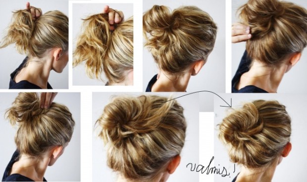 *Ponkkarilenkki yhden kerran tukan ympäri. *Kolmannessa kuvassa näkyy, miten tukka jätetään viimeisellä lenksulla puoliväliin eikä vedetakään poninhännäksi. * Neljännessä kuvassa otetaan sormilla kiinni hiusten latvoista… ja aletaan kiepsauttamaan nutturaa ”oman akselinsa ympäri” kerran. *Jos jää kuudennen kuvan mukaisesti töröttämään jotain hiustuppoja, otetaan niistäkin kiinni ja jälleen kiepsautetaan! Sitten vaan annetaan olla niin kauan kuin mahdollista -nuttura vain nätistyy vanhetessaan :))