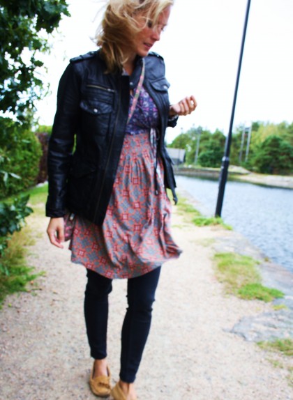 Päällä nahkatakki Asos, tunika Odd Molly (secondhand) ja farkut GT laukku Marimekko