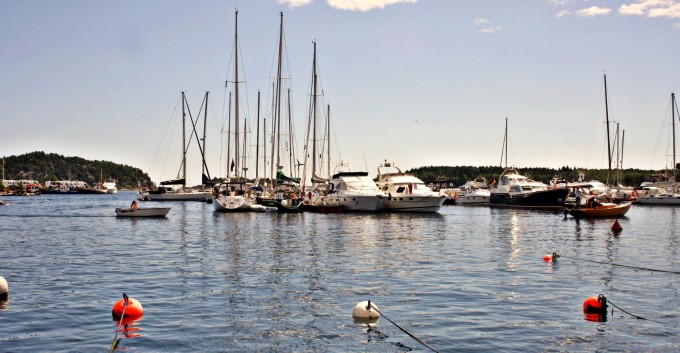 Ja näkee paljon turisteja. Veneily on Norjassa mökkeilyä yleisempi kesäasumisen muoto ja ihmiset taitavat myös olla rohkeampia veneilemään. No, täällä ei esimerkiksi missään ole niin matalaa, että tavallisella paatilla törmäisi karikkoon, vaan jyrkät kalliot tippuvat monta kymmentä metriä suoraan mereen. Missä tahansa voi ajella aika huolettomasti. Näin ollen toki kivoja uimarantapaikkoja on myös jonkin verran vaikeampi löytää.