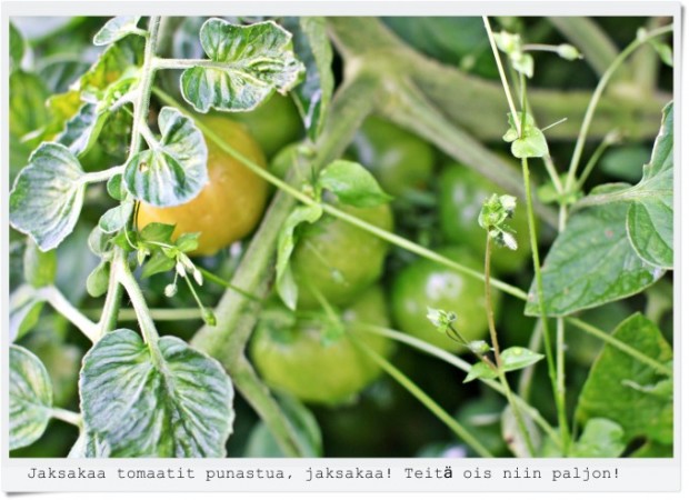Ota tomaatit ikkunalle lautaselle kypsymään. Mitenkäs herneet, joko kaikki on popsittu?