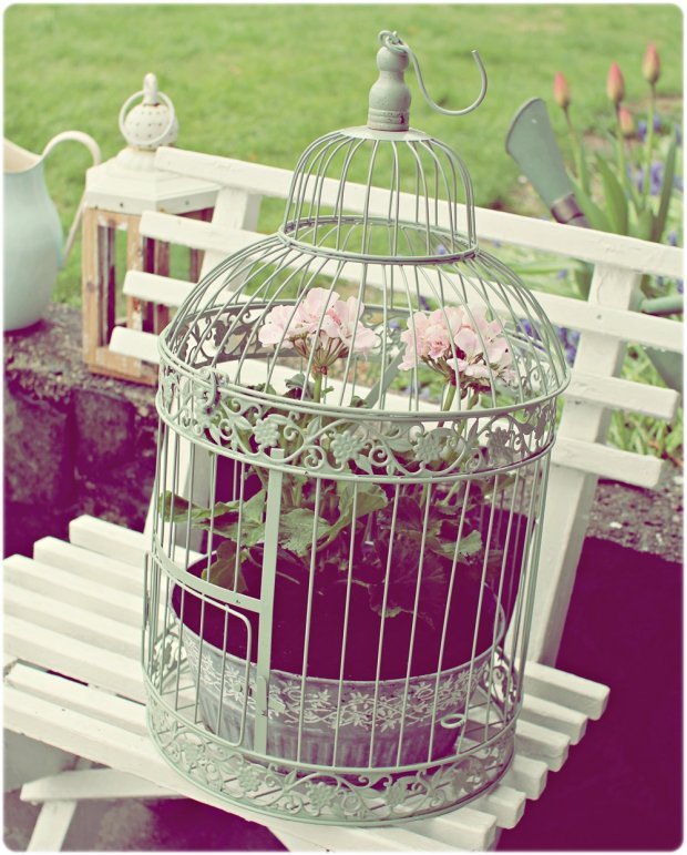 Hauskan näköinen tuo häkkikukkaviritelmä! Katselin vain ensin hölmistyneenä, että miten taioit tuon ruukun ja kukan häkkiin, mutta siinä taitaakin olla irtoava tuo yläosa? 🙂