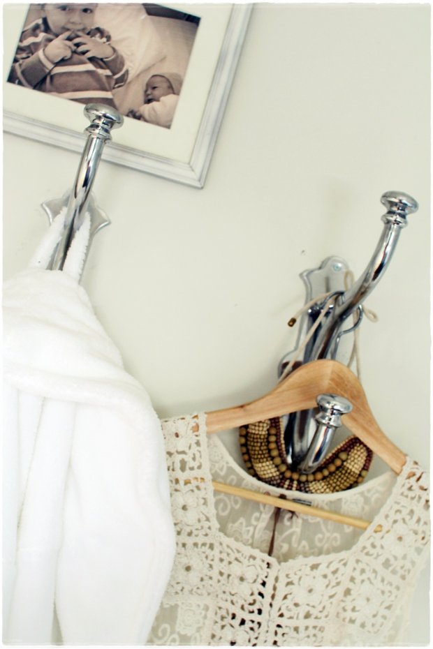 Sain muuten ruuvattua vihdoin tollaiset hopeakoukut makuuhuoneen seinään, jee. Pari vuotta ovat lojuneet kaapin pohjalla odottamassa 😉 Ja koukkujen yläpuolella on valokuva lasten ensikohtaamisesta; Aino päivän vanha ja Olli jännittynyt kaksivuotias ❤