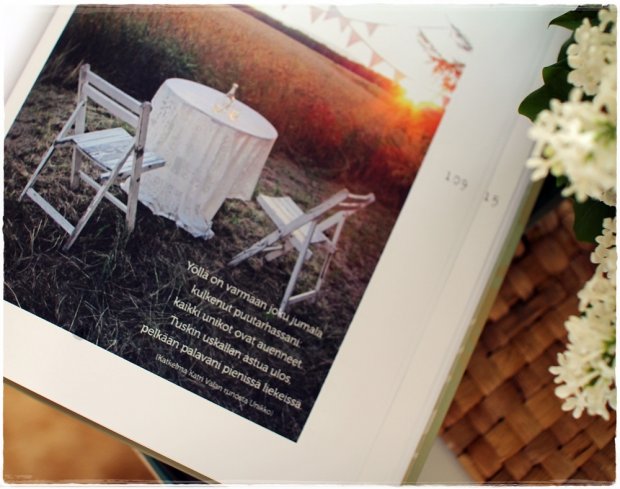 Olen pintapuolisesti tutustunut saamaani kirjaan ja selanut sen parikin kertaa malttamattomana läpi, vaikka oikeasti ja kunnolla mun on tarkoitus säästää sen lukeminen joksikin aurinkoiseksi kesäpäiväksi. Sellaiseen hetkeen kun mulla on kahvia ja lämmintä piirakkaa. Varjossa auringolta, sireenipensaan suojassa ja lintujen visertäessä.