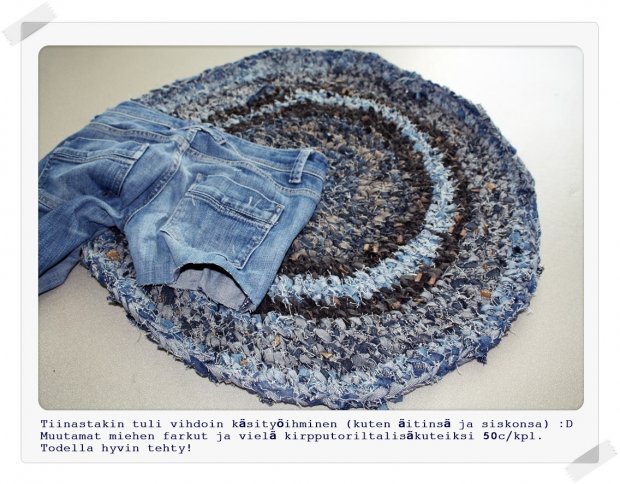 Mistä saisin tuon farkuista tehdyn maton ohjeen? Näyttää niin hienolta, eikä kai se voi vaikea olla? Sopisi hienosti lasten huoneeseen :). Aivan ihania töitä!! Voi kun itsekkin oppisin. Mutta olen iloinen teidän puolesta, että on noin upea käden taito! Hienoa!!