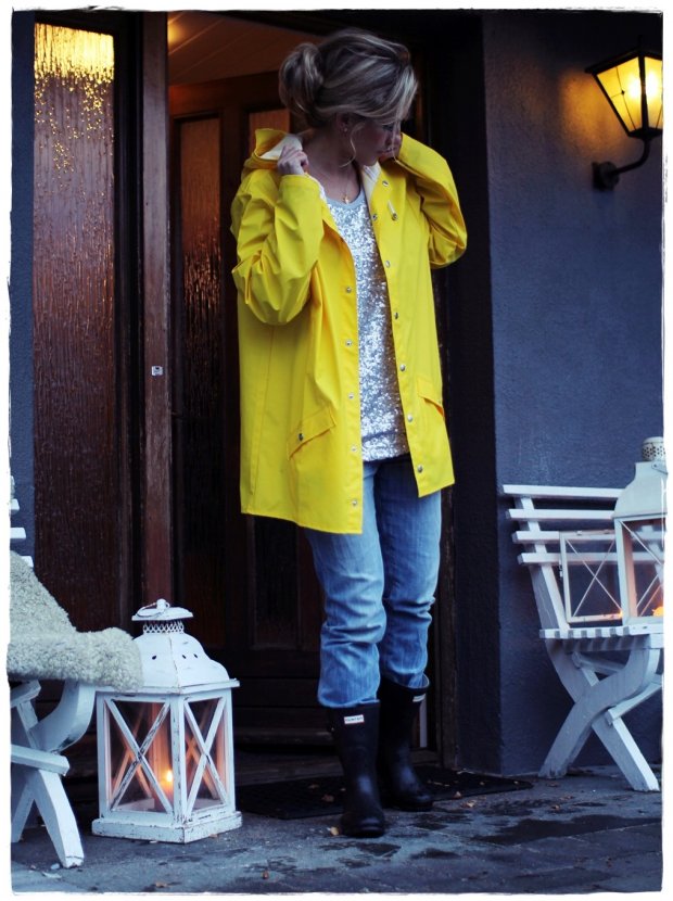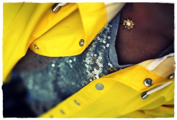 Heipsis 🙂 nyt on ollut taas illallisvieraita ja työkavereiden pippaloita ja vaikka mitä -tänään on ollut pikkasen väsähtänyt fiilis rentoilufarkuissa ja collarissa. Makailtu suurimmaksi osaksi sohvalla villasukissa. Väsähtäneinä sadepävinä ei voi juuri piristävämpää pukeutumista varmaan olla kuin paljetit ja kunnon perinteisen keltainen sadetakki… ja yksi aurinkoriipus. ❤