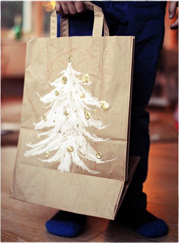 Kuten ehkä tiedättekin, on mulla tapana paketoida lahjoja (siedettävän näköisiin) paperipusseihin; niihin, joissa lahjat on ostettukin. Ja ihan ruskeaan paperipussiinkin voi vaikkapa piirtää liidulla kuusen -ja maalata kultamaalilla muutaman palleron päälle.
