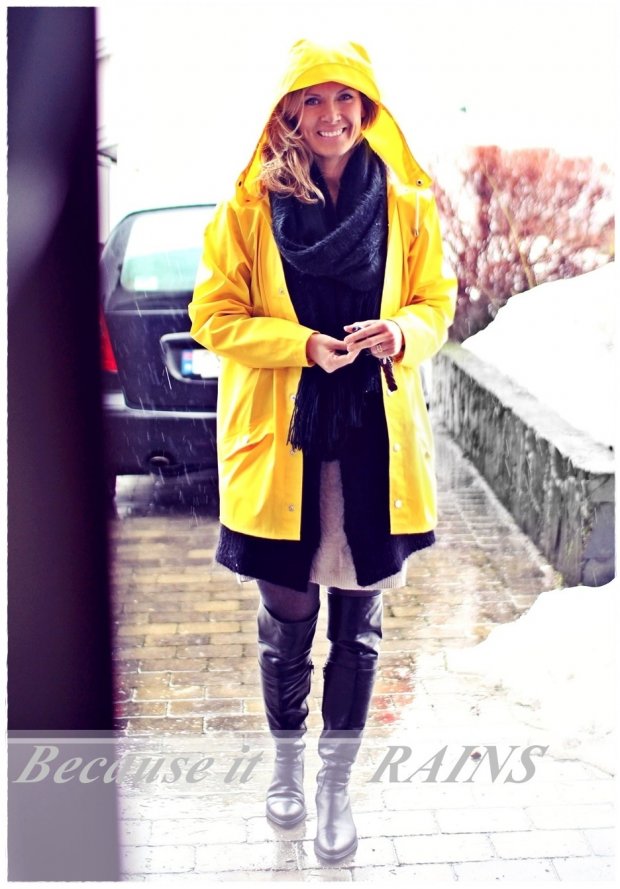 neulemekko ASOS / huivi Only / mohairliivi Sand / saappaat Bianco / sadetakki Rains (saatu)