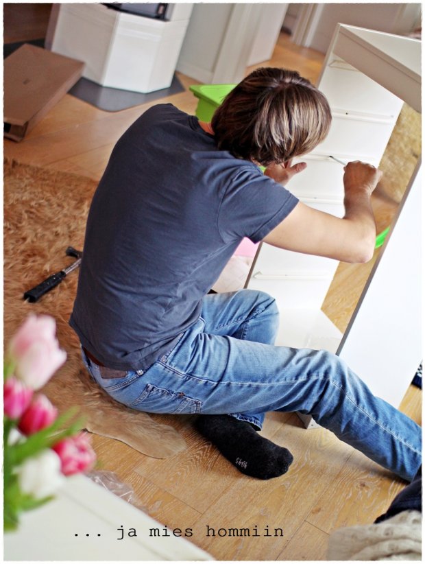 Heh, melkein naurattaa näin kauhean harmoniset kuvat just nyt. Tässä sohvalla velourverkkareissa ja ilman meikkiä ja koko kämppä aika räjähtäneenä lastenhuoneiden ”siivoilujen” jälkeen. Ja mieskin tollanen ihana puuhapete… 😉 Eh. Eka kerta kun se kokoaa tässä perheessä.