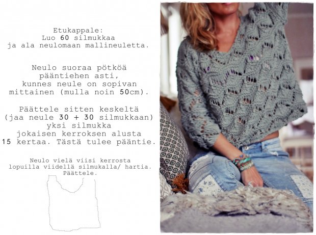 Niin, mietin että tää nyt on just tän vuodenajan neulomuksia. Lanka on sen verran paksua, että neule etenee nopeasti ja saattaa nopsalta hyvinkin valmistua pyhien aikana. Neule on juuri paksuutensa ansiosta tarpeeksi lämmin jo nyt käytettäväksi, mutta kuitenkin niin reikäinen ja ilmava, että sitä voi pitää hienosti myös keskikesällä. Olen paitaa ja vähän ohjettakin vilauttanut jo silloin heinäkuussa tässä postauksessa; voit kurkkasta miten kivasti sopii shortsienkin kanssa! 🙂 Mutta nyt vähän kattavampi ohje… Jos joku vaikka innostuisi -tai saisi kaipaamaansa inspistä kevätneulomiseen.