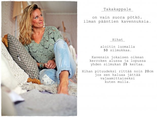 8. Tuo 400g lankaa ei kyllä riitä tuohon koko puseroon. Täällä ollaan tekemässä ja lankakaupoille täytyy lähteä kun loppui kesken.