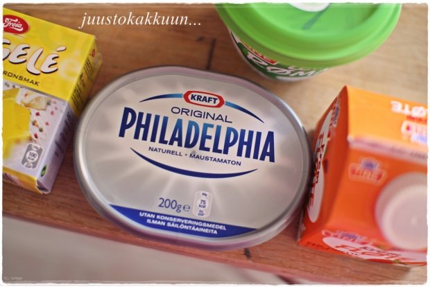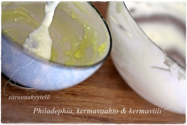 Täytteeksi: Sitruunahyytelöä / maustamatonta tuorejuustoa (esim. Philadelphia) / purkin kermaa vaahdoksi / puoli purkkia kermaviiliä
