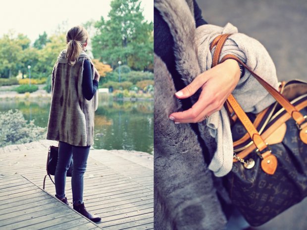 Innostuin ompelemaan nimittäin tollaisen turkisliivin; kangas on Eurokankaasta ja malli niin yksinkertainen, että sen voi ommella vaikka käsin. Eli et tarvitse edes ompelukonetta; vain sakset, neulan ja lankaa. 🙂