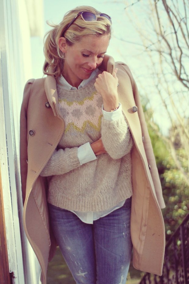 Viikonloppuna päällä on ollut omatekemä, ihan suosisiksi nousut (ja aika pääsiäshenkinen!) neule. Neuleen ohjeen olen jo myynyt Suurelle Käsityölehdelle joten tähän en voi laittaa; toukokuussa voitte sitten kurkata kunnon ohjeen lehdestä ja lukea haastattelua. 🙂 Mietin muuten jo että tää neule toimisi hyvin syksyksi suklaisella tumman ruskealla pohjalla… Voisi tehdä sitten uuden.