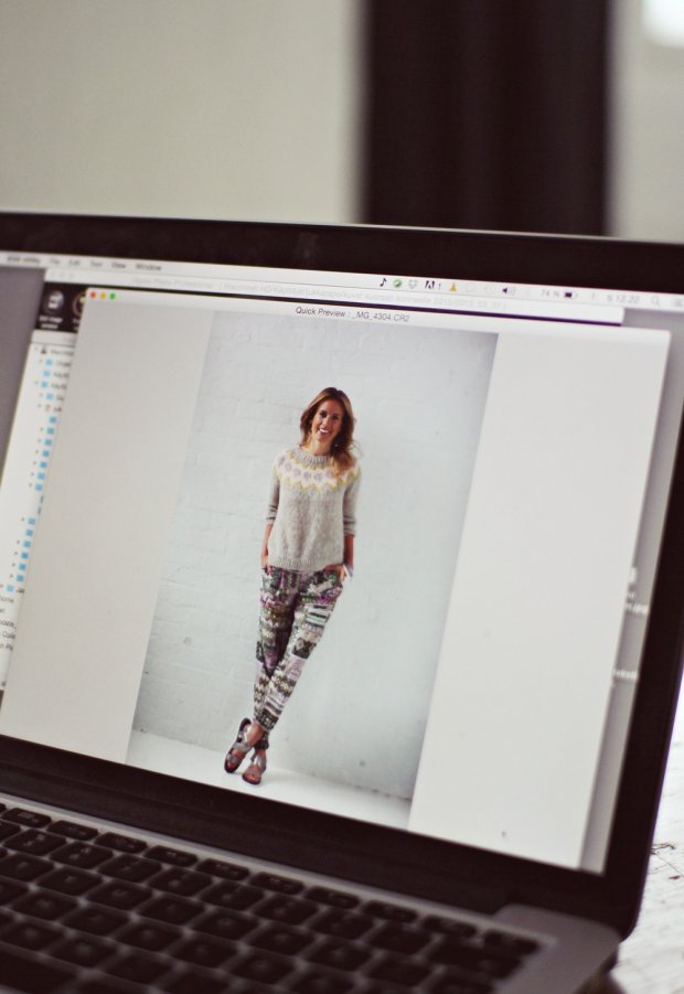 Tällaista tänään. 🙂 Helsingin Kaapelitehtaalla. Muutama tunti Outin, Sannan ja Jukka Rapon (tietokoneella näkyvien kuvien valokuvaaja) kanssa. Tuloksen näette toukokuun Suuressa Käsityölehdessä – ja sieltä löytyy myös ohjeet kuvausvaatteisiin.