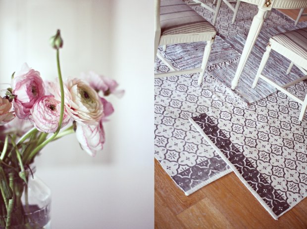 Onpas kivan ja raikkaan näköinen mattokollaasi! Meillä on aika-ajoin olohuoneessa vastaavanlainen, sinne kun on hankala sijoittaa mattoa koska on ”L” mallinen. Muutama vuosi sitten tuskailin kun ei harmaavalkoisia kivoja/edullisia mattoja meinannut löytyä mistään, onneksi nykyään valikoima on parempi, ja juurikin H&M lle tulee kivoja mattoja usein…