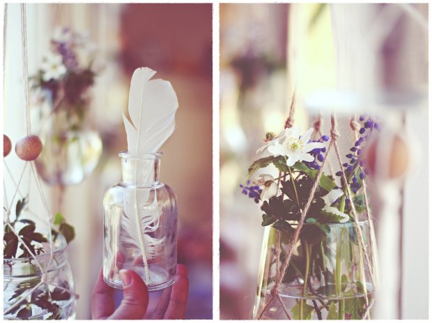 Ainakin lapsiperheissä on varmaan kaikenlaiset voikukka- ja villiorvokkikimput aika tuttu ilmiö ja nyt se kausi alkaa taas lähestyä, joten sateisen lauantain kuluksi askartelin ikkunaan roikkumaan muutaman kukka-amppelin pieniä kimppuja varten. Näihinhän ei tarvitse kuin yhden oksan tai kukan ja tulos on sitä kauniimpi (mitä simppelimpi).