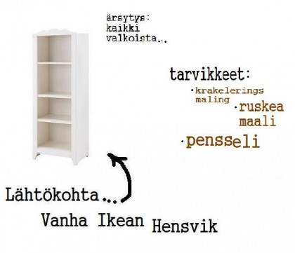 …Eli yksi DIY -projekti tarvikkeinaan Ikean hylly, maalia, pensseli ja krakeleringsmalingia (-mitä se on suomeksi?). …ja hylly possun kanssa samaan tyyliin krakeloiduksi! Hylly oli siinä huikilla että heittäisinkö sen menemään, mutta koska periaatteessa kaikki (halvat ja persoonattomatkin) jo olemassaolevat jutut täytyy yrittää käyttää ennen uuden hankkimista, oli maalaaminen ainoa vaihtoehto. Ja tietysti takalevyn poistaminen, jottaJatka lukemista ”DIY Hensvik”
